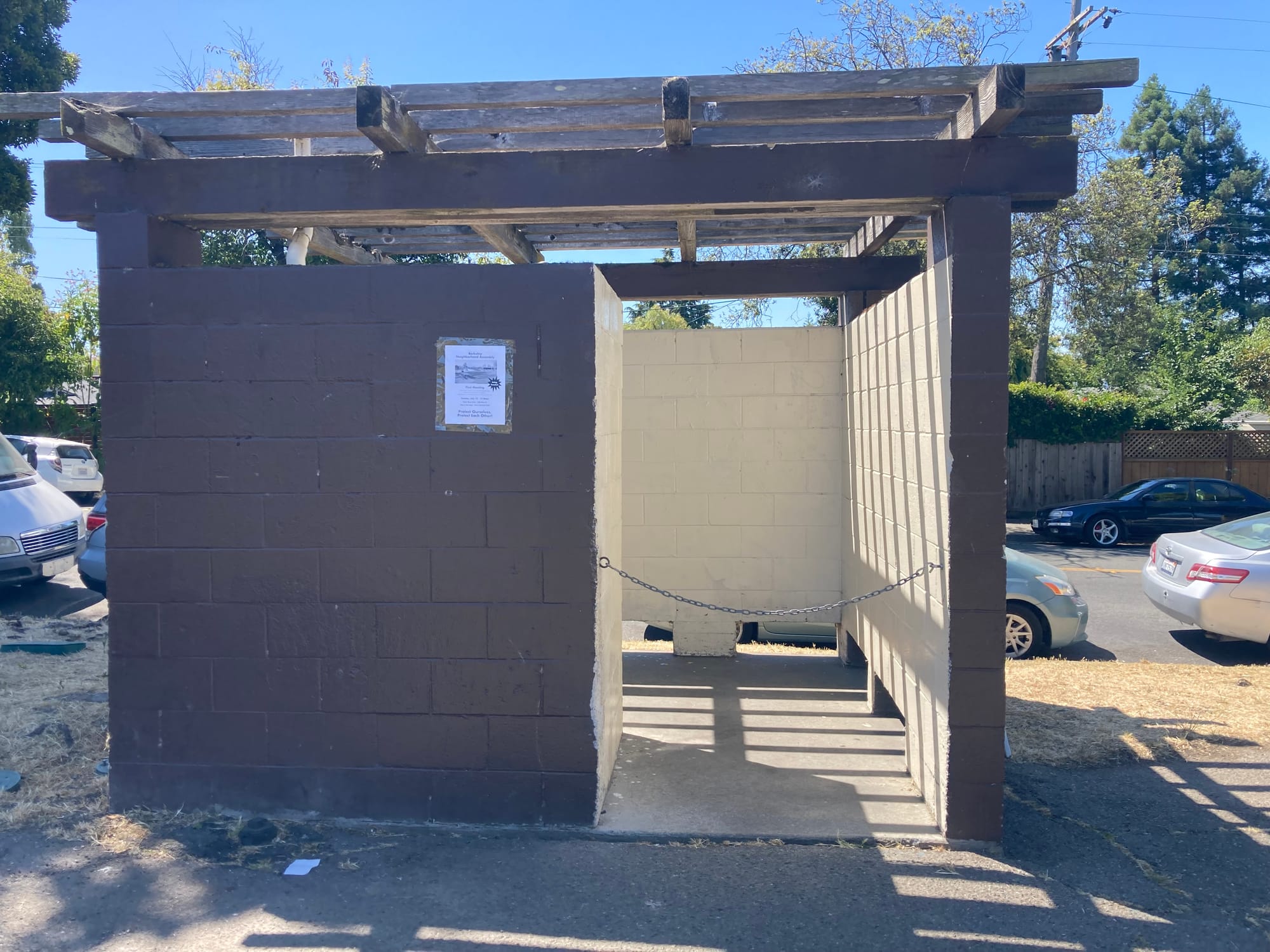This bathroom has a design that appears to be unique to Berkeley. They feature a doorway but no door, only a large linked chain that you hook from one side of the doorway to the other to indicate that the restroom is occupied. These restrooms also have no roof, although some have a wooden trellis with a large opening to provide some shade. They have a toilet with toilet paper, but no sink and certainly no soap, no hand dryer, and no lighting. These types of restrooms can be found at Cedar Rose Park, Cordonices Park, and Live Oak Park. Because they lack a door, they are open 24/7. I stopped by Cedar Rose Park’s restroom with a friend during a Sunday morning run and asked her if she thought it smelled bad. “It would if it weren’t completely open-air,” she said.