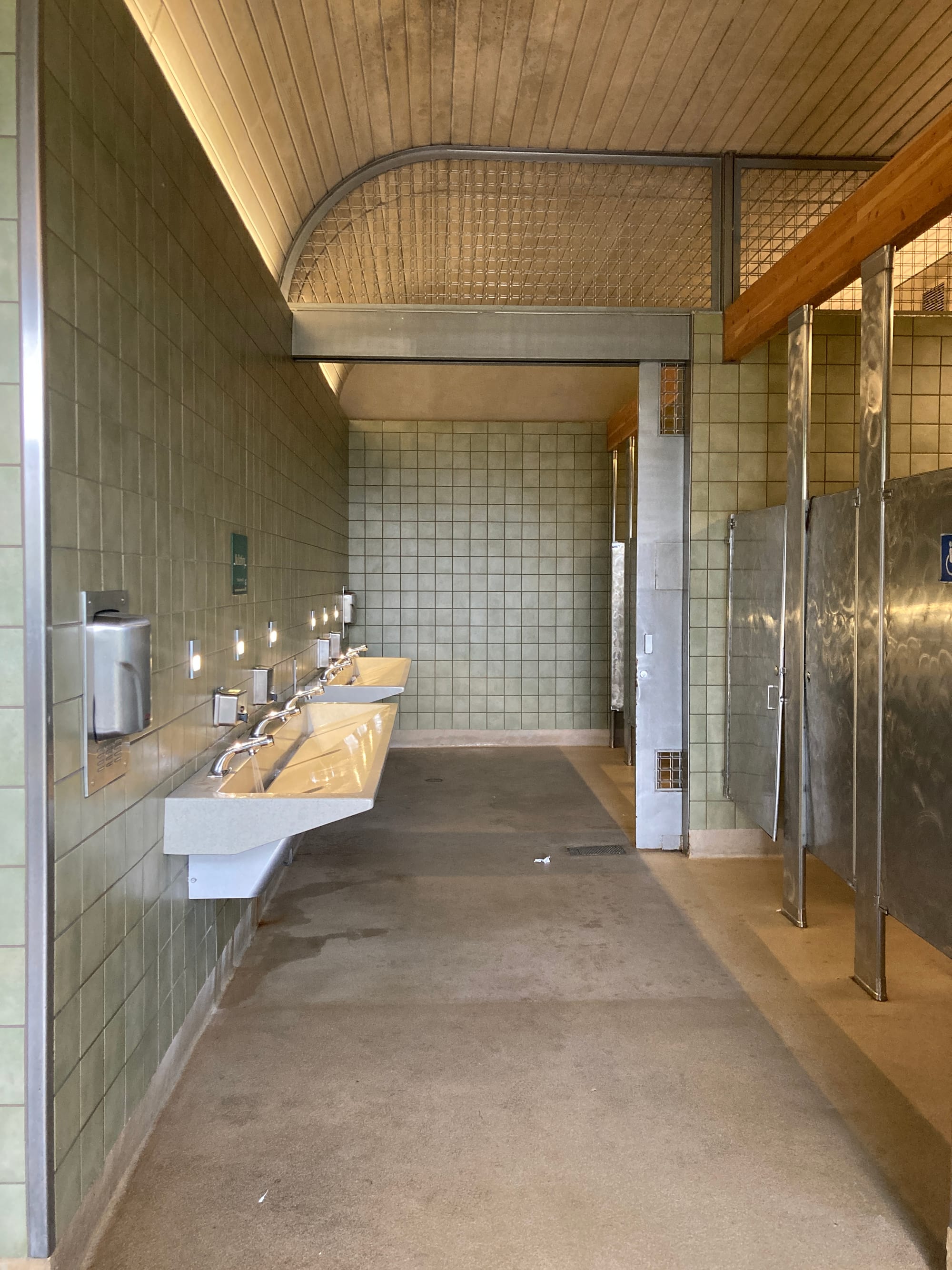Tucked into the hillside on the north side of Mission Dolores Park is a gleaming, green gem of a bathroom. Inside you will find spotless floors, fresh air, toilet paper, soap, a functional hand dryer and a changing table. It has many stalls in gendered sections, along with a single stall genderless restroom, which has extra room for children and other people needing assistance. The wood paneled ceiling curves into the green tiled walls, which like almost every restroom I visited, did not have mirrors. This restroom lost one point for a tiny bit of toilet paper and water on the floor, but besides that, it is the gold standard Bay Area public bathroom.