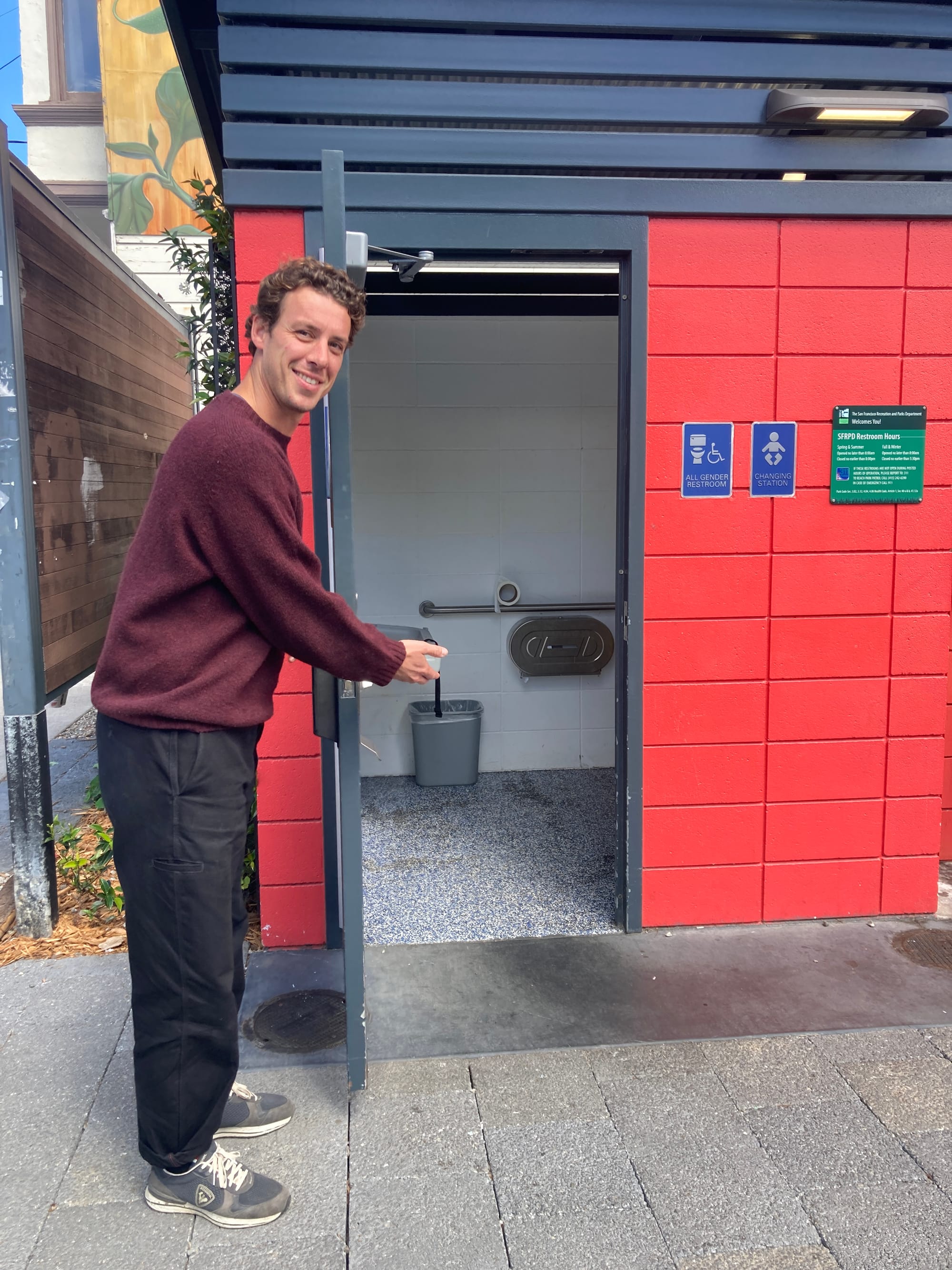 The final $300,000 restroom is a showstopper. Its exterior is made of cement blocks painted fire-engine red and wooden panels that still smell like fresh trees. There is a small sign on the wooden wall above the exterior sink and soap dispenser reminding users that “this restroom facility was generously donated by Public Restroom Company & Volumetric Building Companies.” Like many of the restrooms, it loses a few points for a bit too much water and toilet paper on the floor and its lack of a hand dryer.