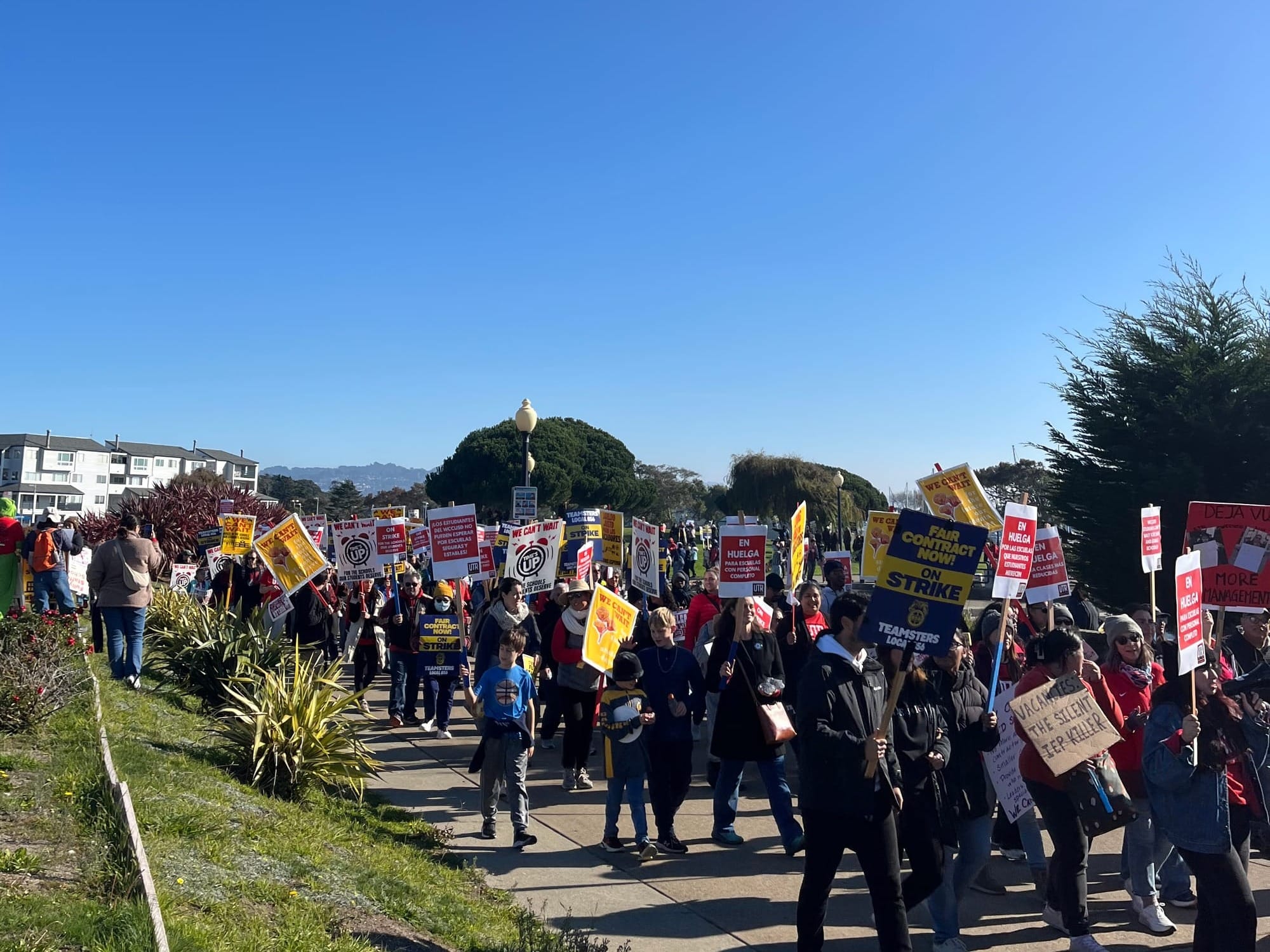 Teachers were joined for the first two days of the strike by West Contra Costa custodians, food service workers, and bus drivers represented by Teamsters Local 856, but the striking Teamsters reached an agreement with the district on Sunday and returned to work on Monday. It was clear on Tuesday, however, that the Teamsters agreement had not done much to dissuade striking teachers, who were still picketing in large numbers, or to encourage absent students to return to school. Some families, misled by the district’s announcement of the Teamsters agreement over the weekend, showed up to district schools on Monday, only to turn around and go home when they found teachers still walking the picket line.