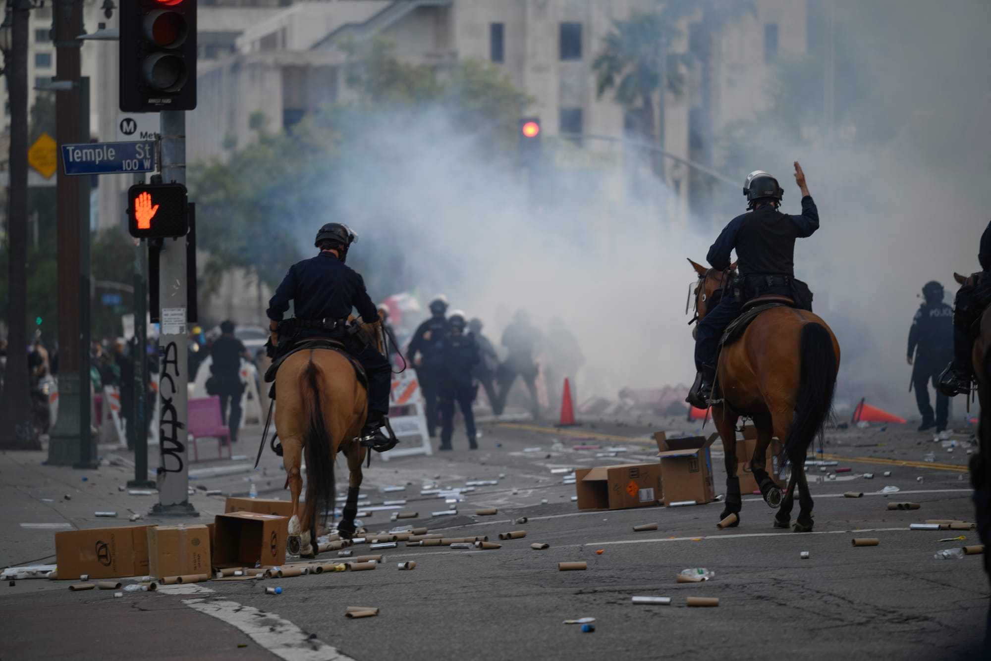 On Sunday, I saw a crazy police presence with horses — police on horses. The protesters had set up a barrier. They were just sitting and staying around in front of City Hall. I really saw brutality — [the police] were all standing and would wear their masks — and they were all LAPD police and Sheriff’s Department.