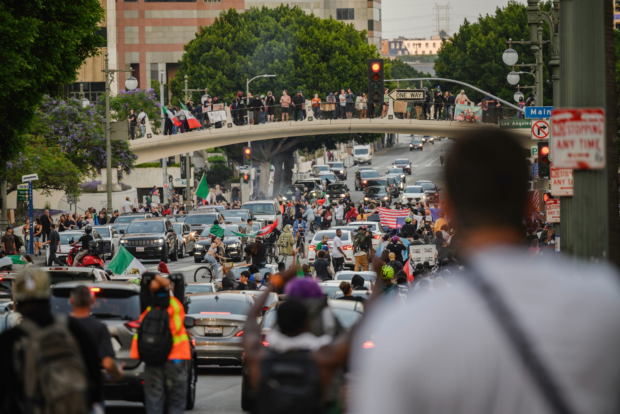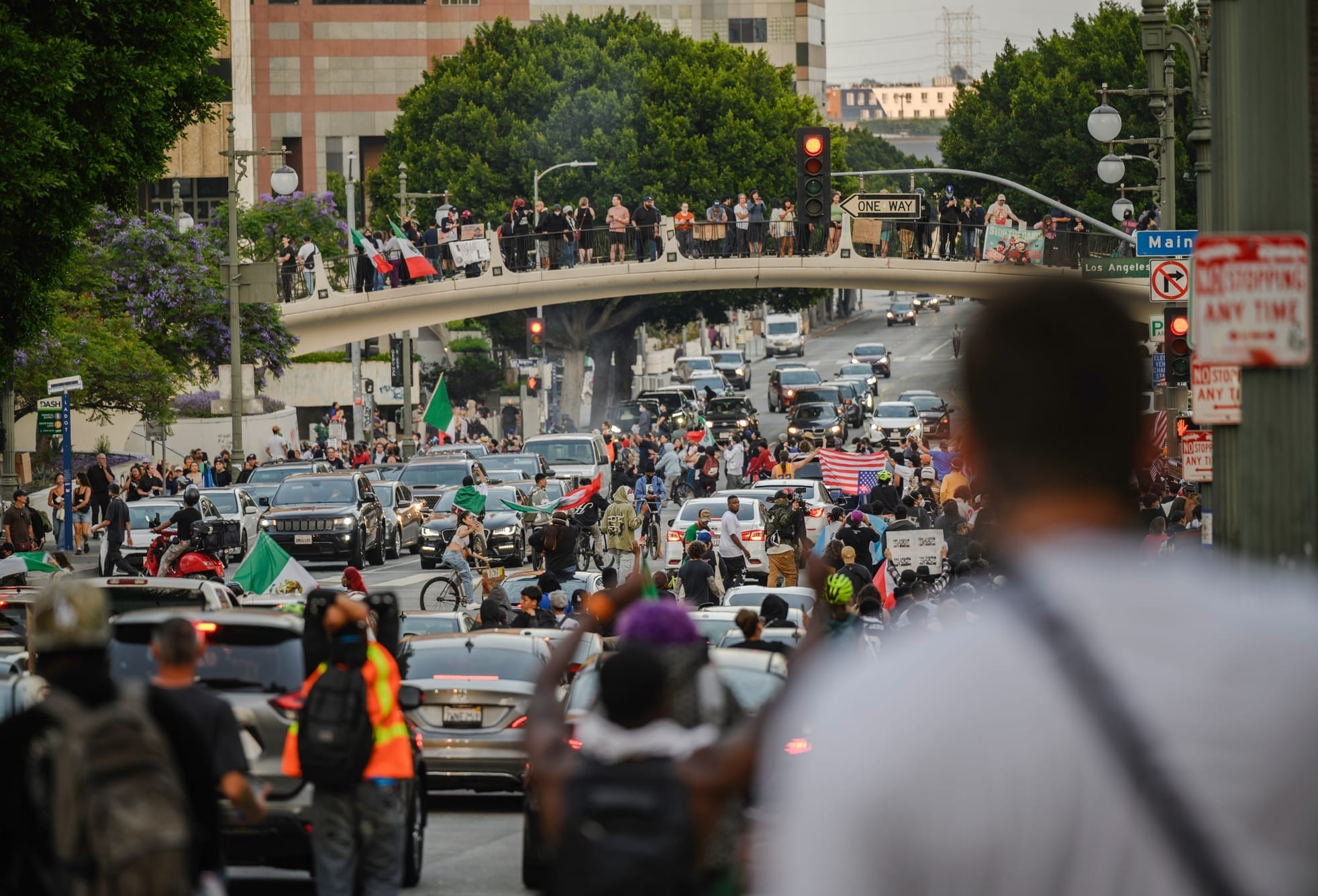 I saw some kids on a skateboard — I literally mean kids, some of them are like 12 years old, 13 years old — something you see everyday in LA. Kids on a skateboard. One of the symbols of LA, they are doing that just alongside the protests going on.