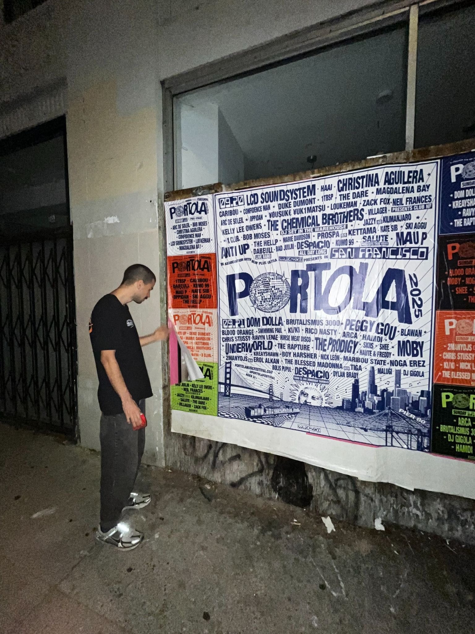On our way back we spotted a large bill for the Portola festival plastered on a boarded up empty retail space. “How many artists are from the Bay on the lineup?” I ask. We counted 3.